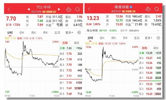 受上述消息影响,隆基绿能、TCL中环股价今日上午盘中直线拉升。同花顺数据显示,截至收盘,隆基绿能报13.23元/股,涨1.85%,总市值1002.6亿元;TCL中环报7.7元/股,涨1.72%,总市值311.3亿元。